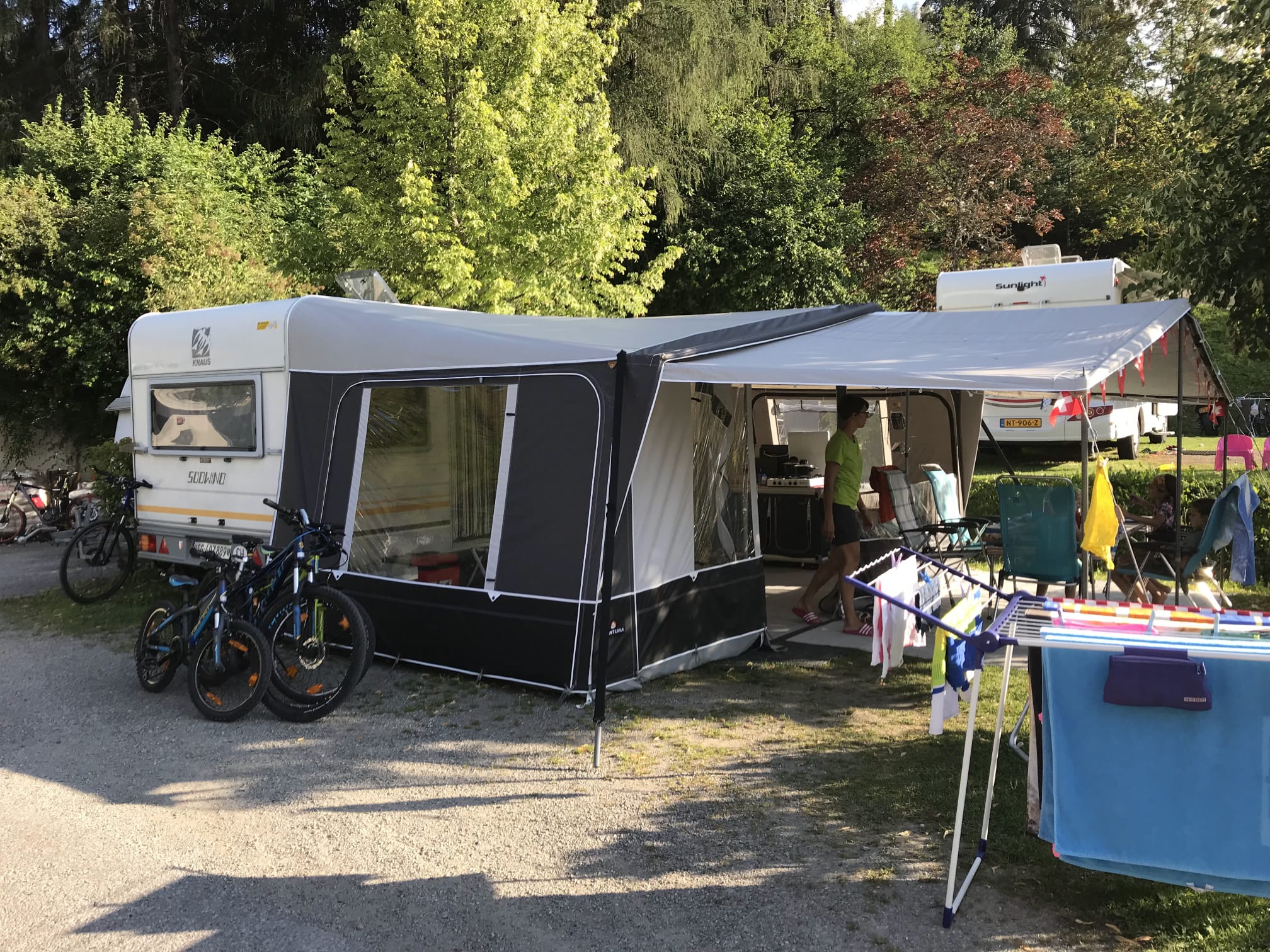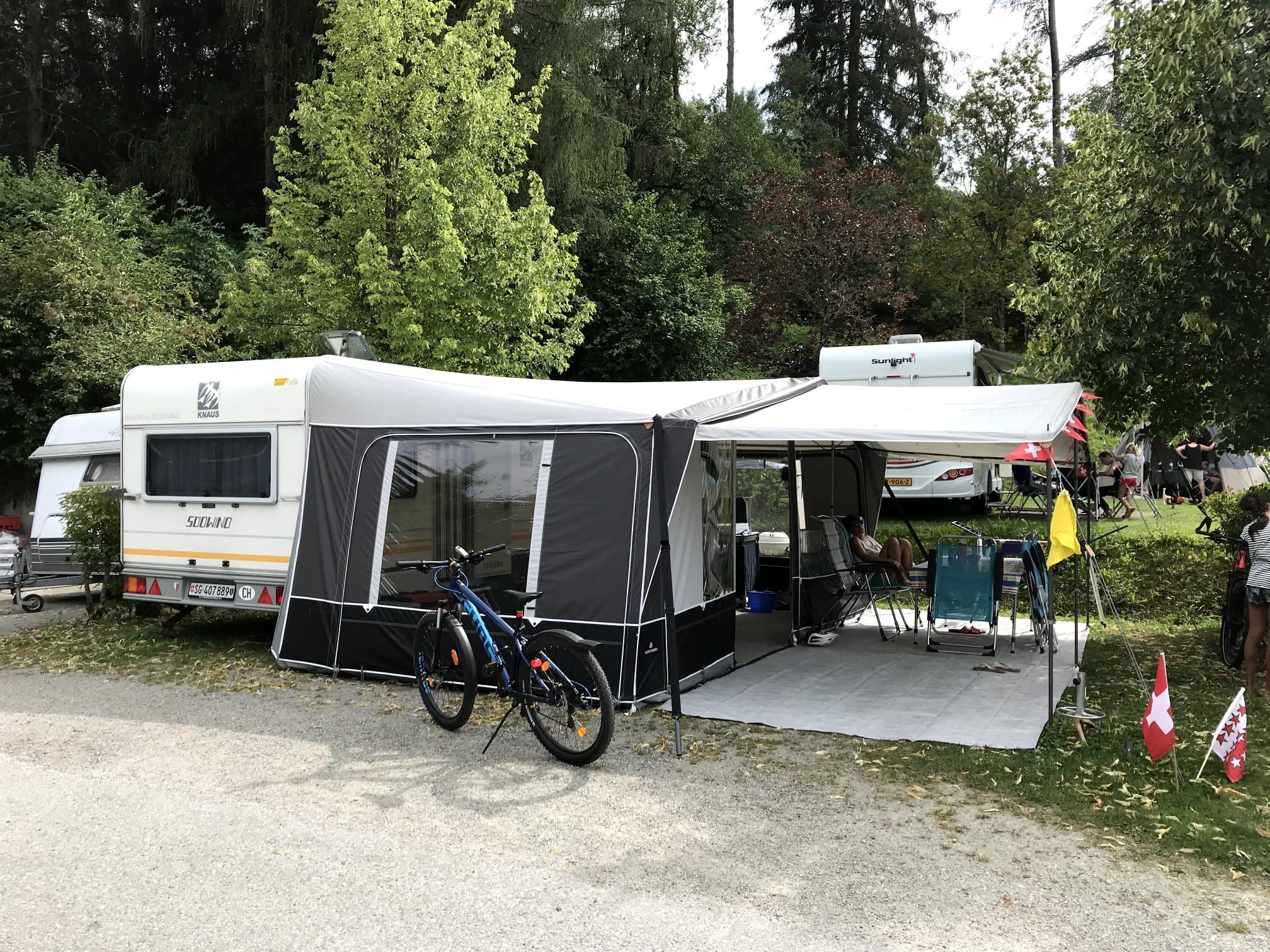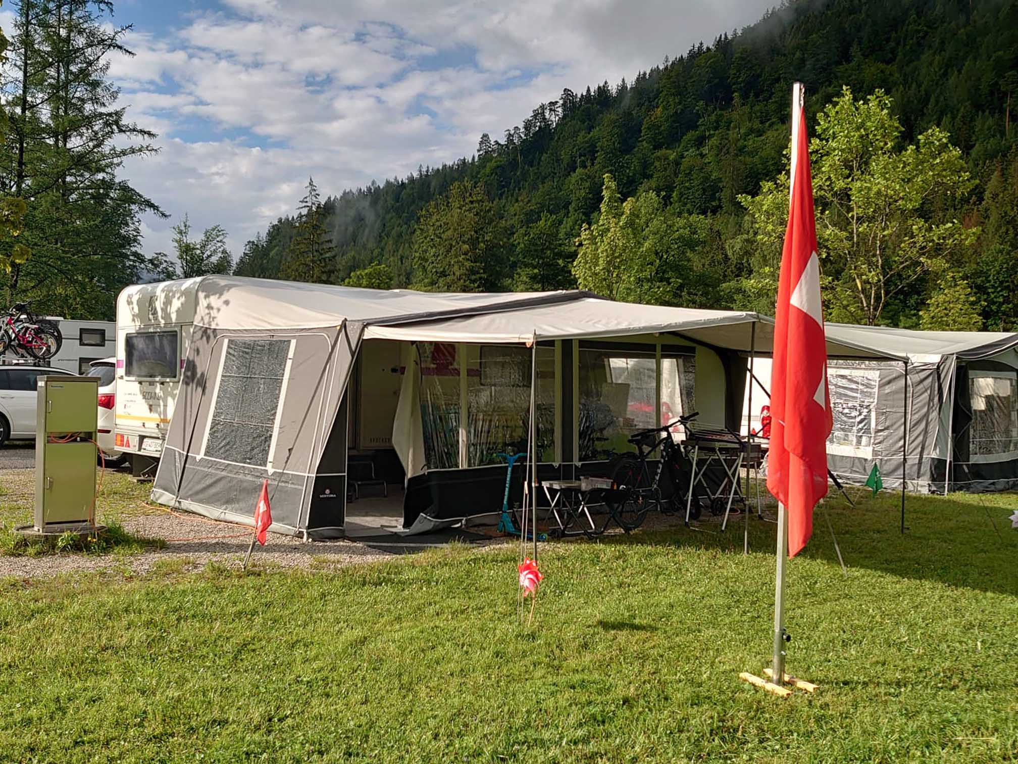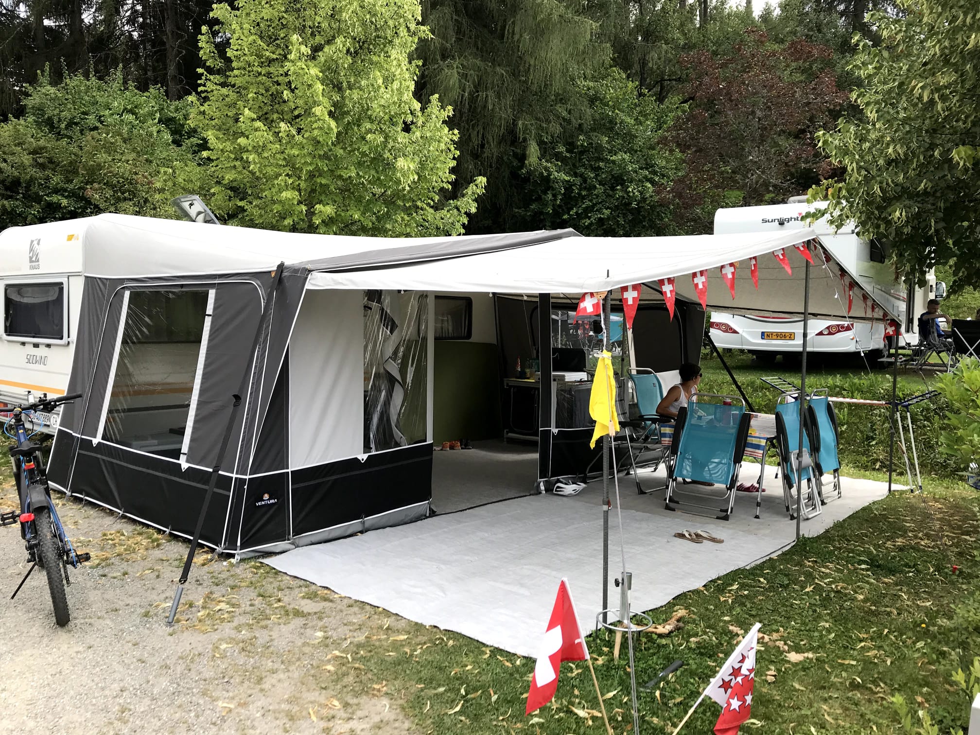 Vorzelt Isabella 3 x 6 m und Vor-Vorzelt/Sonnendach 2,2 x 6 m.